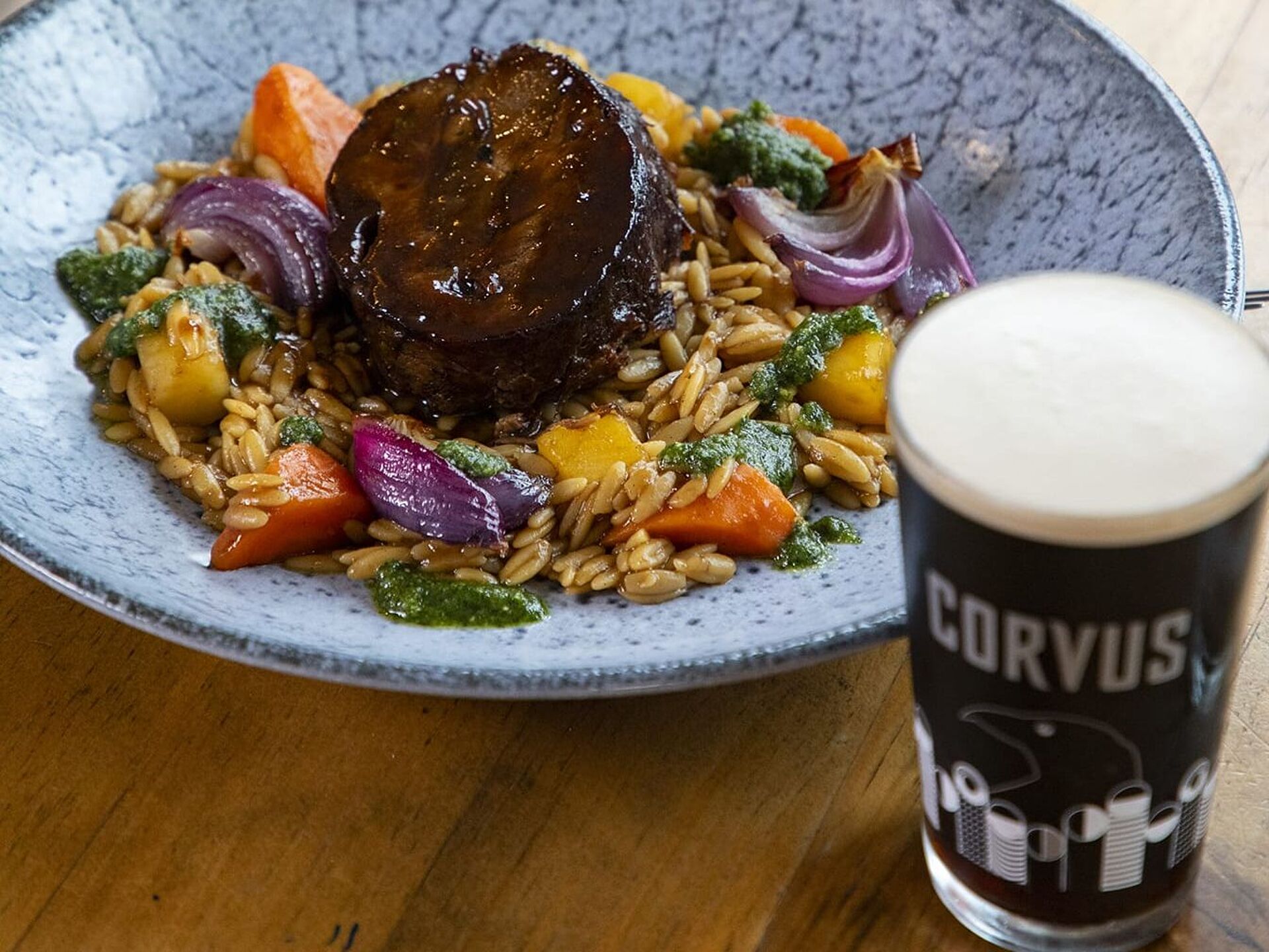 We’re excited to announce a delicious new addition to our menu this month: Braised Blade of Beef in Corvus Stout, served with a hearty stew of root vegetables and orzo, topped with fresh tarragon pesto.
